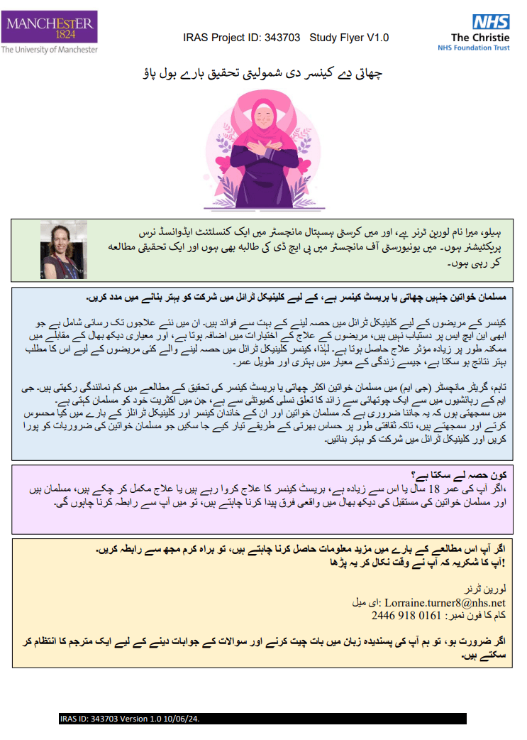 This study focuses on how Muslim women’s religion and cultural norms shape their views and experiences with breast cancer and clinical trials, as well as the perspectives of their families and healthcare providers. The goal is to create recruitment strategies and materials that are culturally and spiritually sensitive, improve understanding of cancer and clinical research, and provide better cultural awareness training for healthcare professionals.
