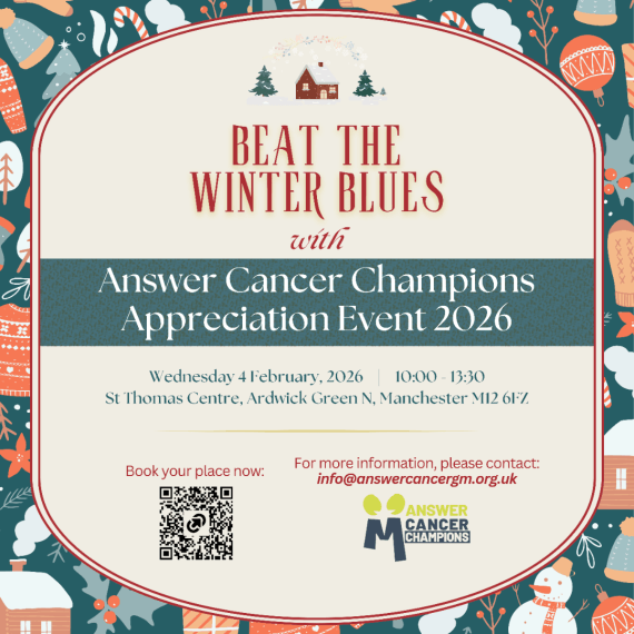 Join us for the Answer Cancer Champions Appreciation Event — a day packed with exciting presentations, a celebration of how brilliant you all are, a delicious lunch, and a special performance from the Manchester Wellbeing Cancer Choir (back by popular demand!).